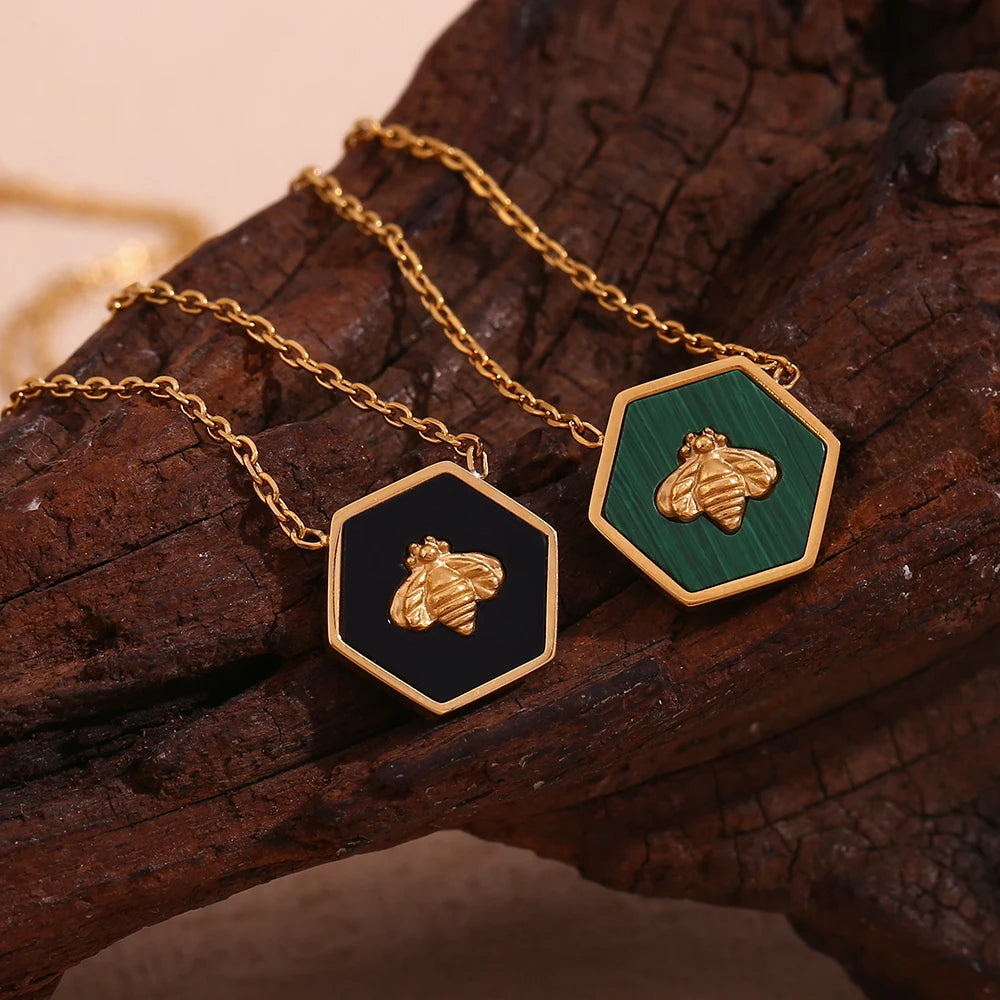 The Queen Bee Necklace is a statement of regal elegance, blending luxurious design with nature’s vibrant beauty. Featuring a striking black and green color palette, this exquisite piece showcases a finely detailed bee pendant, symbolizing strength and harmony. The rich, deep hues complement the intricate craftsmanship, making it a perfect accessory for those who appreciate refined style. Whether worn as a bold accent or a subtle nod to nature’s majesty, the Queen Bee Necklace adds a touch of sophistication to any outfit. Elevate your jewelry collection with this captivating piece, designed for those who exude confidence and grace.